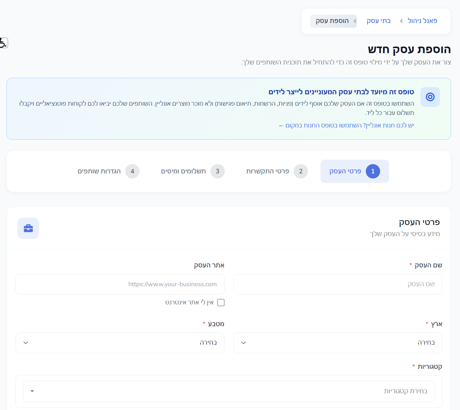 במסך יצירת העסק תופיע הודעה שמסבירה שהטופס הזה מיועד לעסקים שאוספים לידים כמו פניות, הרשמות או קביעת פגישות.