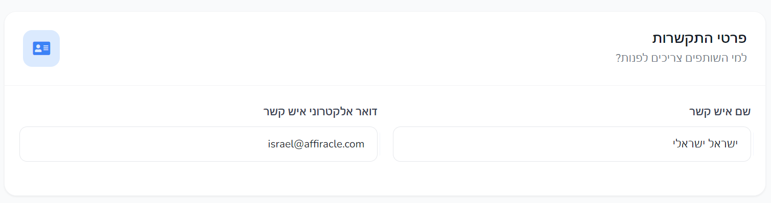 כאן מגדירים את איש הקשר שאליו שותפים או צוות המערכת יוכלו לפנות בעת הצורך.