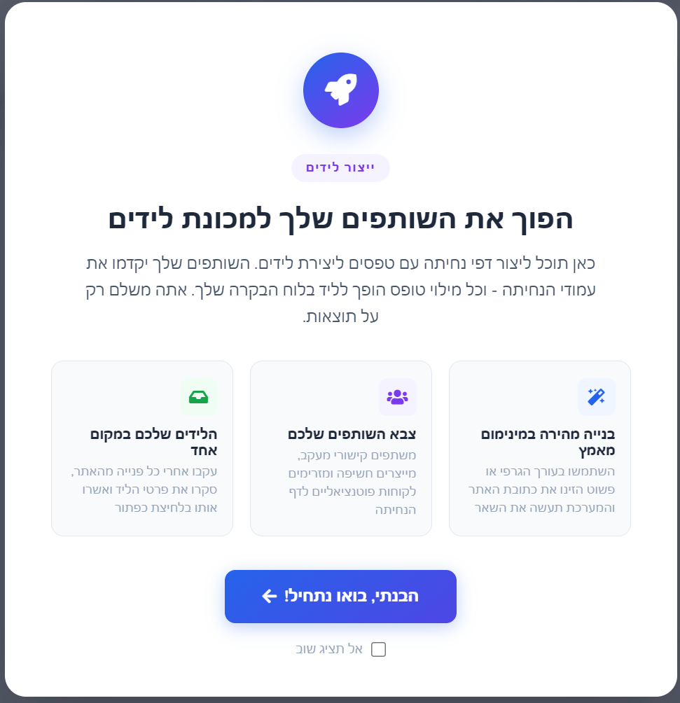 המערכת מציגה הסבר קצר על התהליך: בונים עמוד נחיתה, מקשרים אותו לקמפיין CPL, והשותפים שולחים אליו תנועה שמייצרת לידים.