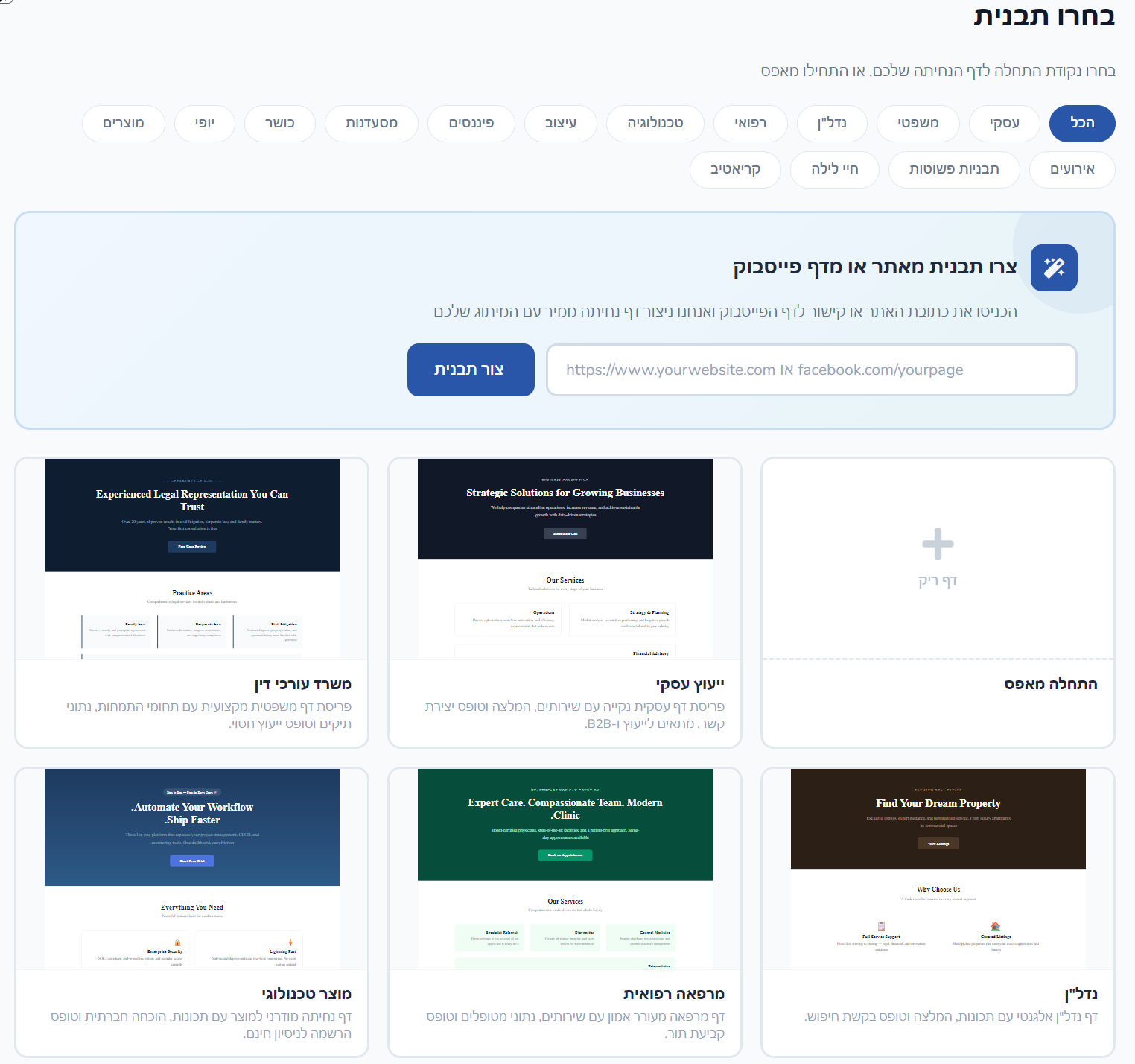 במסך בחירת התבניות אפשר לסנן לפי קטגוריה, לבחור עמוד ריק, או להזין URL של האתר/פייסבוק שלכם כדי שהמערכת תיצור עבורכם מספר וריאציות מוכנות.