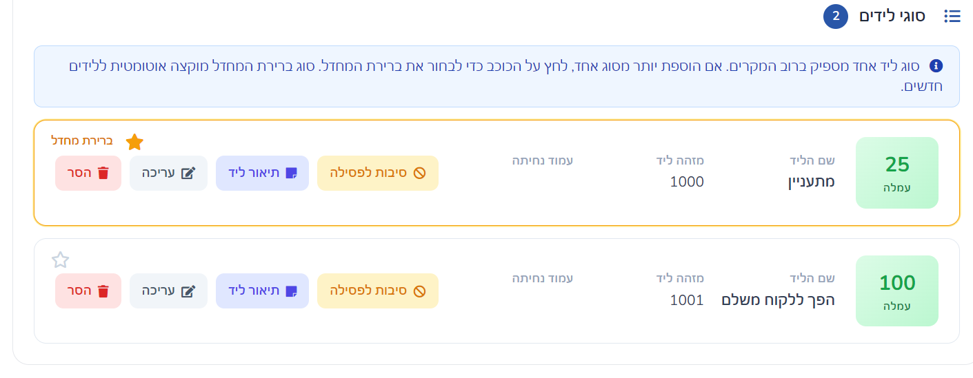 • לסמן איזה סוג ליד הוא ברירת המחדל.