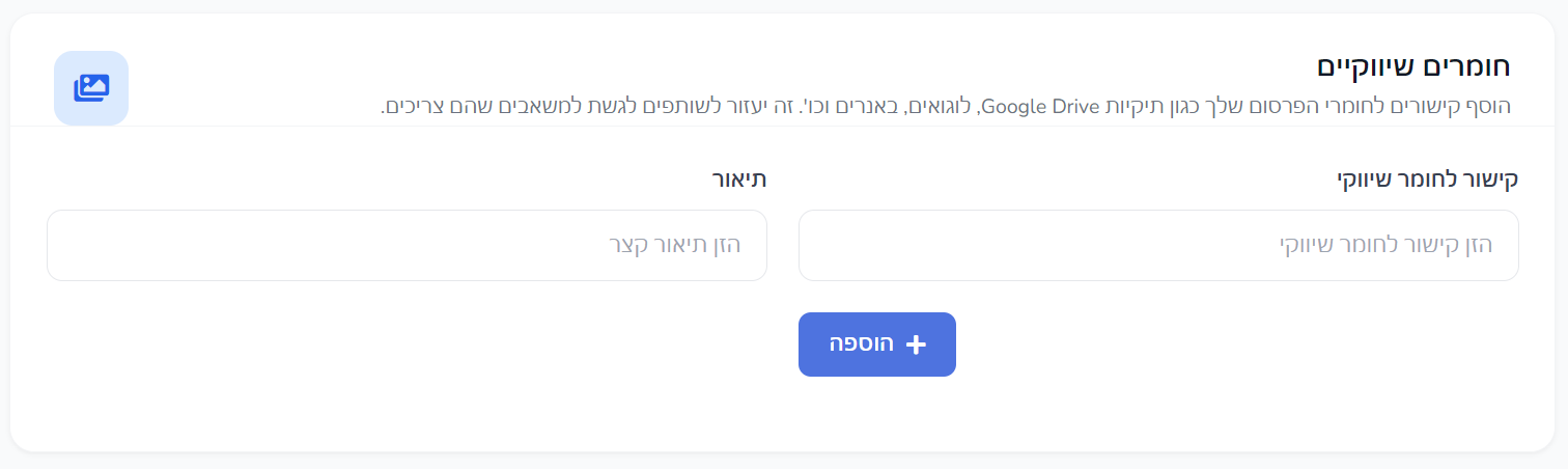 מומלץ להוסיף לשותפים קישורים לחומרים שיווקיים, כמו תיקיית דרייב, לוגואים, קריאייטיבים, באנרים או מסמכי מיתוג.