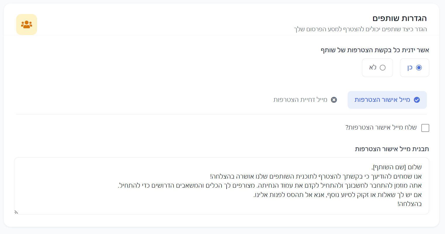 אפשר לבחור אם כל שותף יתקבל אוטומטית או שרק לאחר אישור ידני.