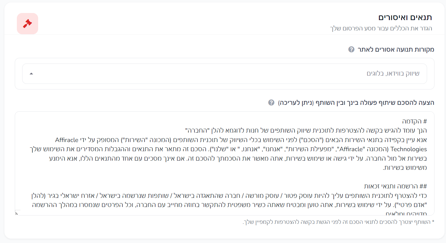 במסך זה אפשר להגדיר מקורות תנועה שאינם מותרים, ולהוסיף או לערוך הסכם שיתוף פעולה בין העסק לבין השותפים.